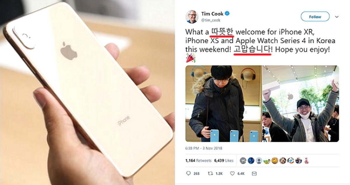 팀 쿡은 "이번 주말 한국에서 아이폰 XR과 아이폰 XS 그리고 애플 워치 시리즈4가 따뜻한 환영을 받았습니다! 고맙습니다! 행복하길 바래요"라고 말했다.