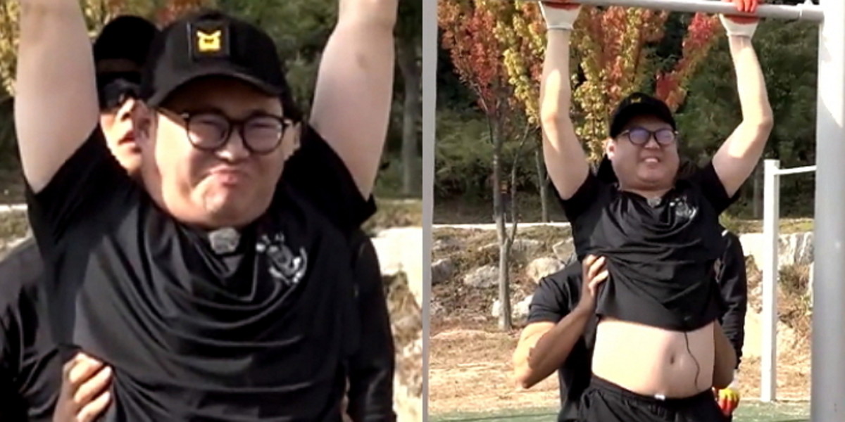 감스트는 결국 교관의 도움까지 받아 가며 턱걸이를 시도했고, 교관 덕분에 그의 배가 살포시 드러났다.
