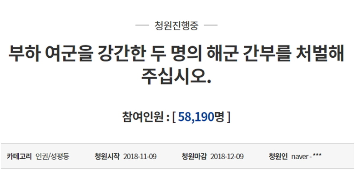 [인사이트] 장형인 기자 = 부하 여군을 강간한 해군 간부를 처벌해달라는 청원이 하루만에 '5만'을 넘기며 국민들의 지지를 받고 있다.
