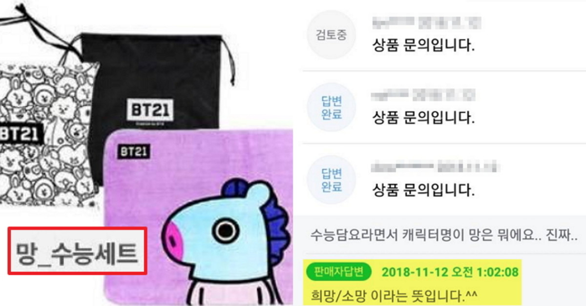 BT21 측은 수능을 맞이해 위 7가지의 캐릭터가 새겨진 수능 담요 및 방석 세트를 판매하게 됐고, 용품의 명칭은 각각의 캐릭터 이름을 본따 만들었다.
