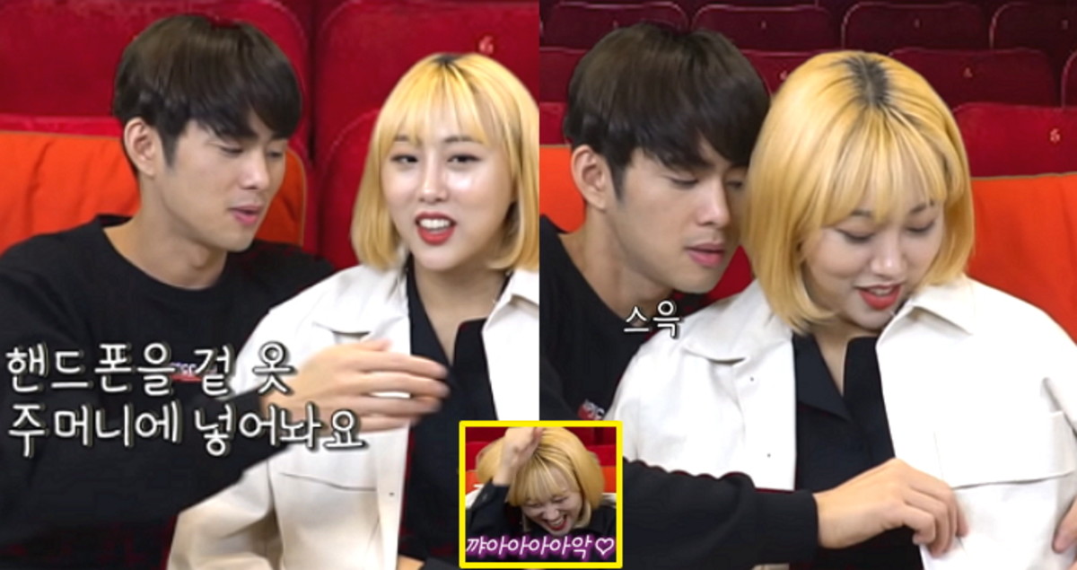 두 사람은 영화관에 있는 썸 타는 커플로 빙의 돼 직접 스킨십하는 모습을 보여줬다.