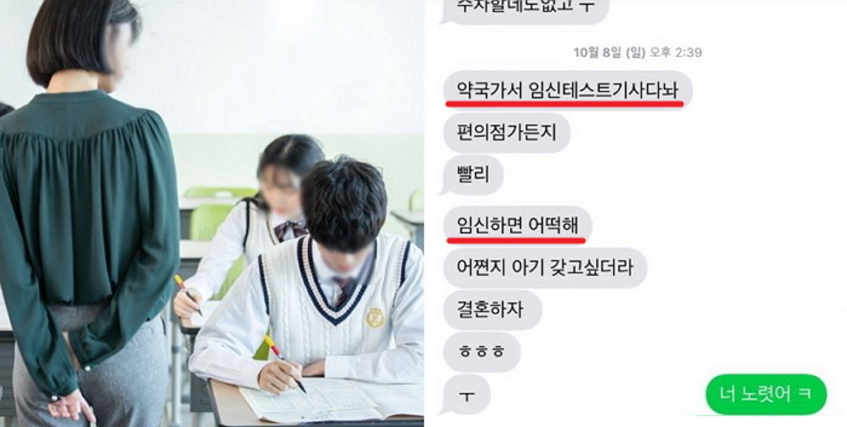 여교사는 A군에게 "약국가서 임신테스트기 사다 놔. 임신하면 어떡해. 어쩐지 아기 갖고 싶더라. 결혼하자"고 말했고, A군은 "너 노렸어"라고 답했다.