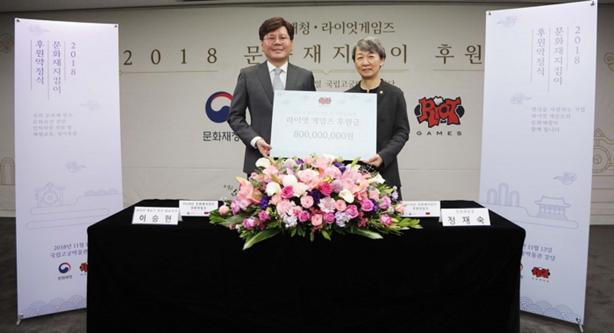 13일 리그 오브 레전드의 개발 및 유통사인 라이엇 게임즈가 서울 종로구에 위치한 국립고궁박물관 강당에서 문화재청과 함께 '2018 문화재지킴이 후원 약정식'을 진행했다고 밝혔다.