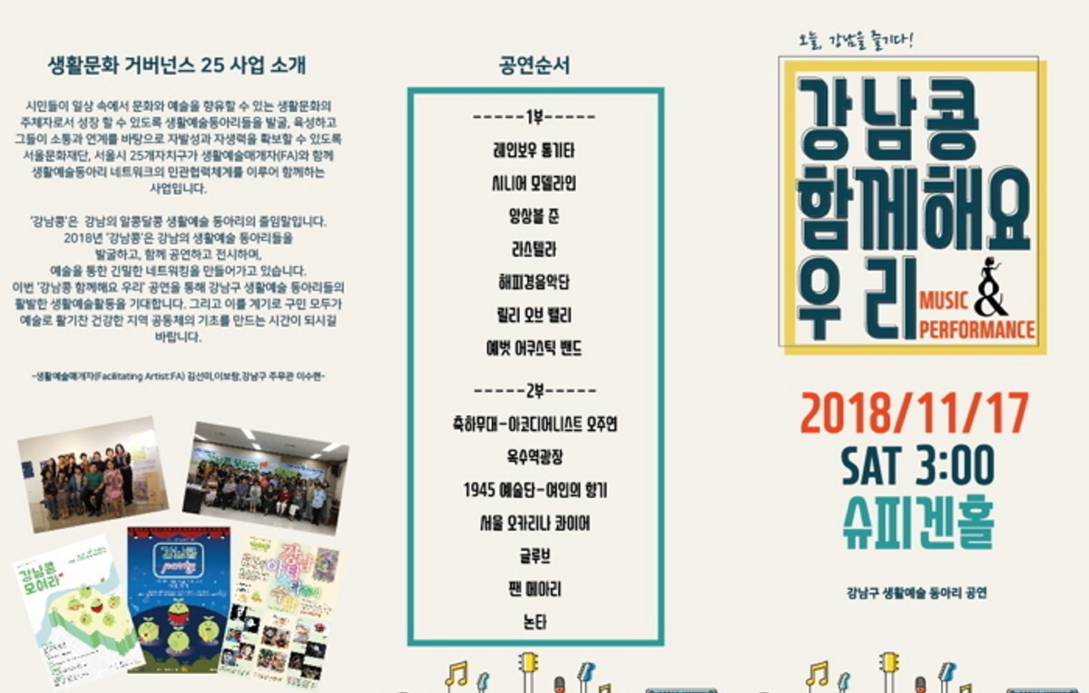 올해 처음 선보인 이번 사업은 8월 연합 공연과 10월 전시회에 이은 세 번째 개최로 '강남콩 함께해요 우리'라는 주제로 진행된다.