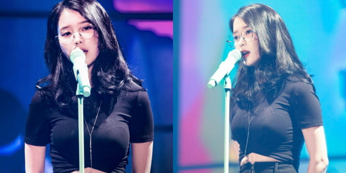 아이유는 검은색 반소매 크롭티에 'DLWLRMA(이 지금)'이라고 적힌 치마를 입은 채 '안경' 무대에 올랐다.