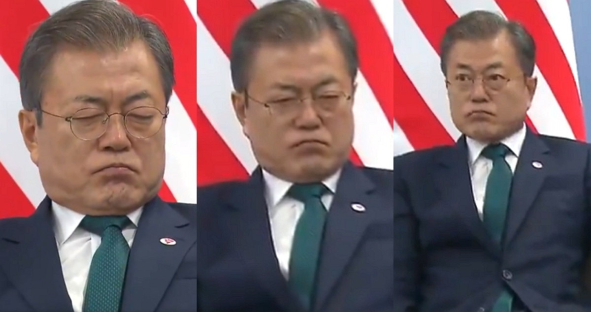 회담장에서 문재인 대통령이 졸았다는 의견과 생각에 잠겼다는 주장이 서로 교차하고 있다.