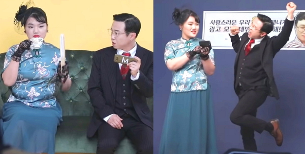 마음먹고 꾸민 송이 매니저와 핫한 CF의 모델이 돼 신난 듯한 박성광의 모습.