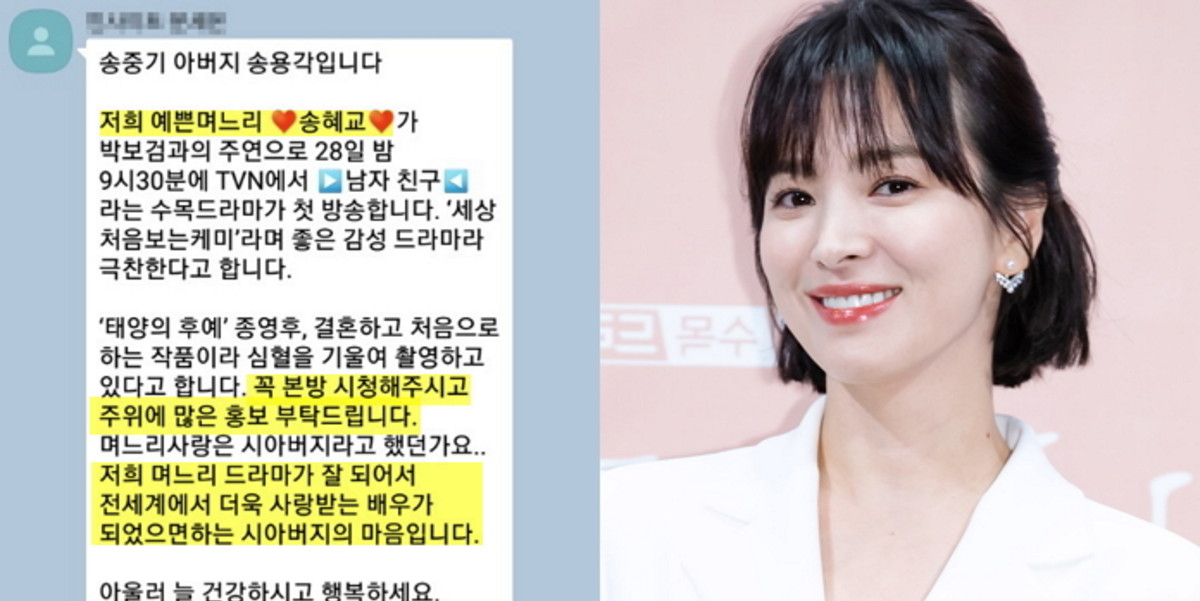 [인사이트] 권길여 기자 = 며느리 사랑은 시아버지라고 했던가. 배우 송중기의 아버지가 며느리 송혜교의 복귀작인 '남자친구' 홍보에 발 벗고 나섰다.