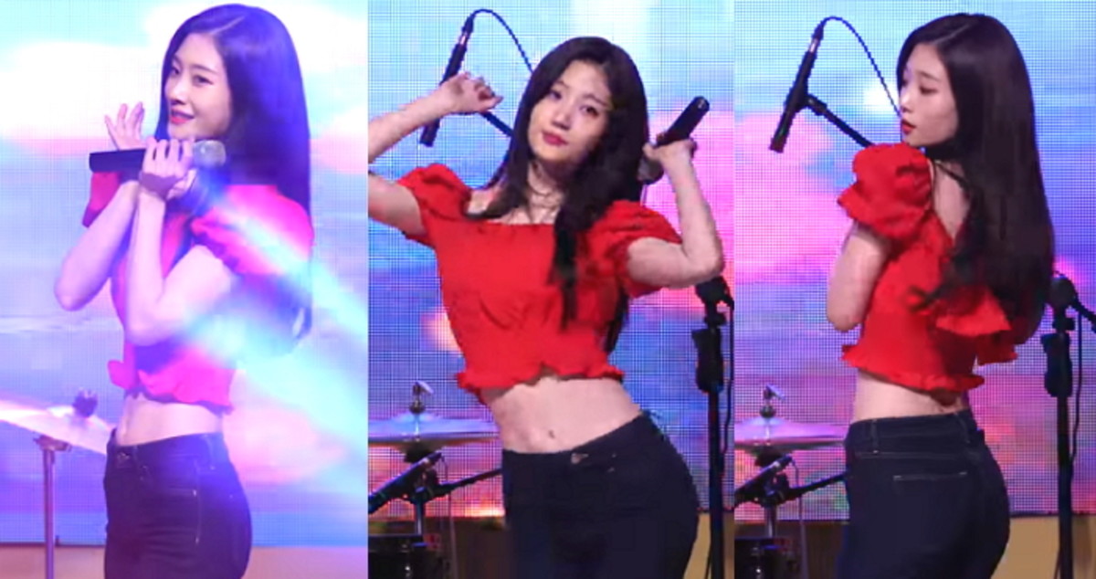 이날 어깨가 봉긋한 붉은색 크롭탑을 입고 무대에 올라선 정채연은 가녀린 허리 라인으로 팬들의 시선을 강탈했다.