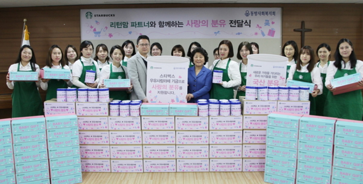 25일 스타벅스의 리턴맘 바리스타 50여명은 지난 11월 23일 서대문구 창천동에 위치한 동방사회복지회(회장 김진숙)를 방문해 새로운 가정을 기다리는 아기들이 1년간 먹을 수 있는 분유 2,500개를 전달하고 아기와 위탁모를 위한 선물 박스 제작 봉사활동을 전개했다.