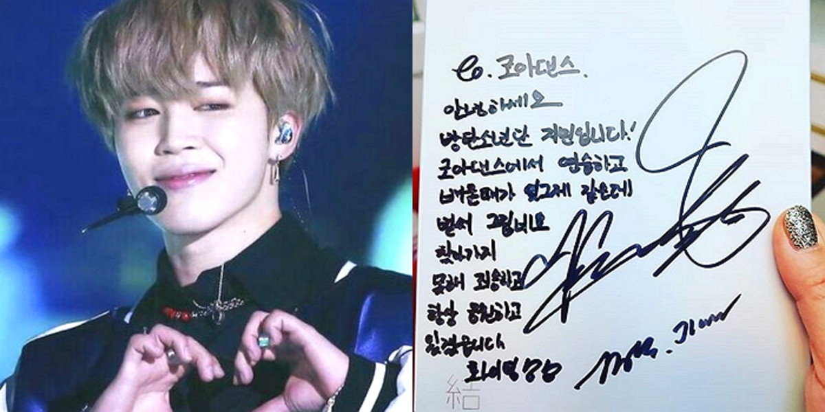 지민은 자필 편지를 통해 "코아댄스에서 연습하고 배울 때가 엊그제 같은데 벌써 그립네요. 찾아가지 못해 죄송하고 항상 응원하고 있겠습니다. 파이팅!"이라고 전했다.