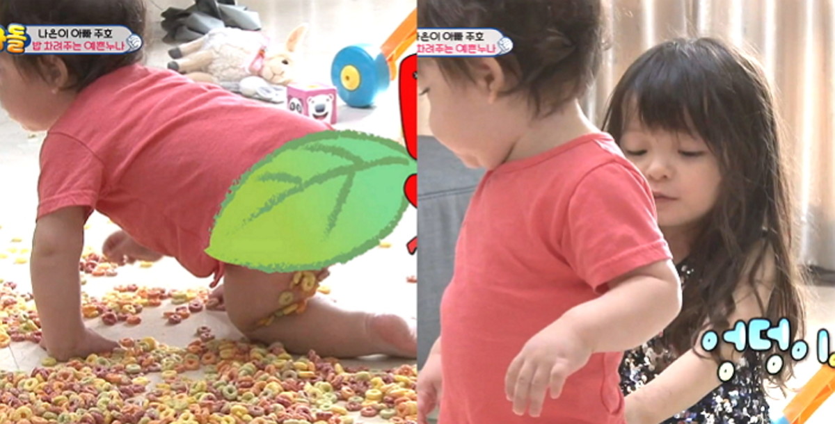 불편함을 느낀 건후가 칭얼거리자 다가온 나은이는 "엉덩이에 붙었네?"라며 건후의 엉덩이에 붙어있던 시리얼을 떼 자신의 입에 '쏙' 넣고 말았다.