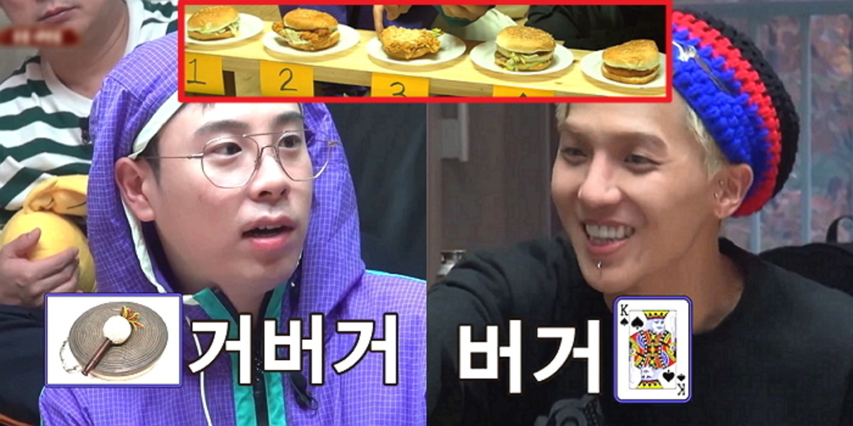 참깨빵 사이 패티와 채소 등이 든 햄버거 다섯 개가 두 사람 앞에 등장했다. 송민호와 피오는 시각, 후각을 이용해 정답을 맞혀야 했다.