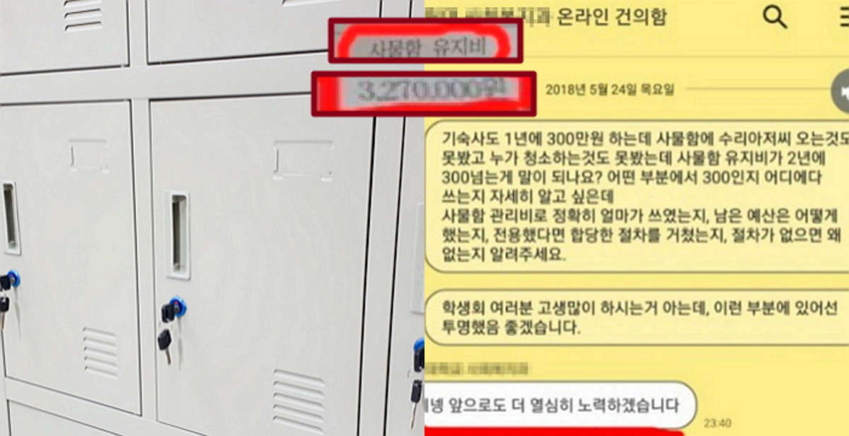 한 학생이 해당 학과의 온라인 건의함에 "사물함 수리나 청소 등의 관리상황을 못 봤다면서, 사물함 유지비가 2년에 300만원 넘게 나온다는 게 말이 되냐"라는 의문을 제기했다.