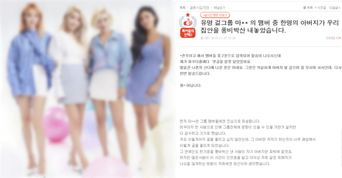 누리꾼은 "유명 걸그룹 마**의 멤버 중 한명의 아버지가 우리 집안을 풍비박산 내놓았습니다"라는 제목의 글로 긴 설명을 시작했다.
