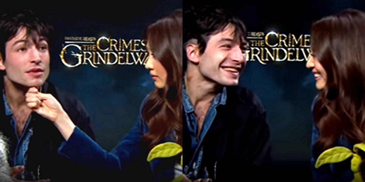 수현은 곧바로 에즈라 밀러 턱에 손을 조심스럽게 가져다 대며 털을 떼어줬다.
