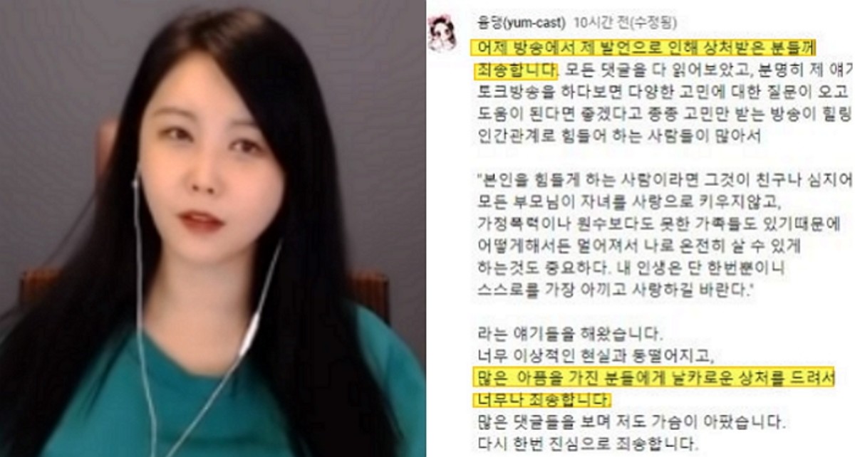방송 후 윰댕의 이 같은 발언에 대해 누리꾼들의 비난이 이어졌고 그는 결국 1일 유튜브 계정을 통해 이를 자성했다.