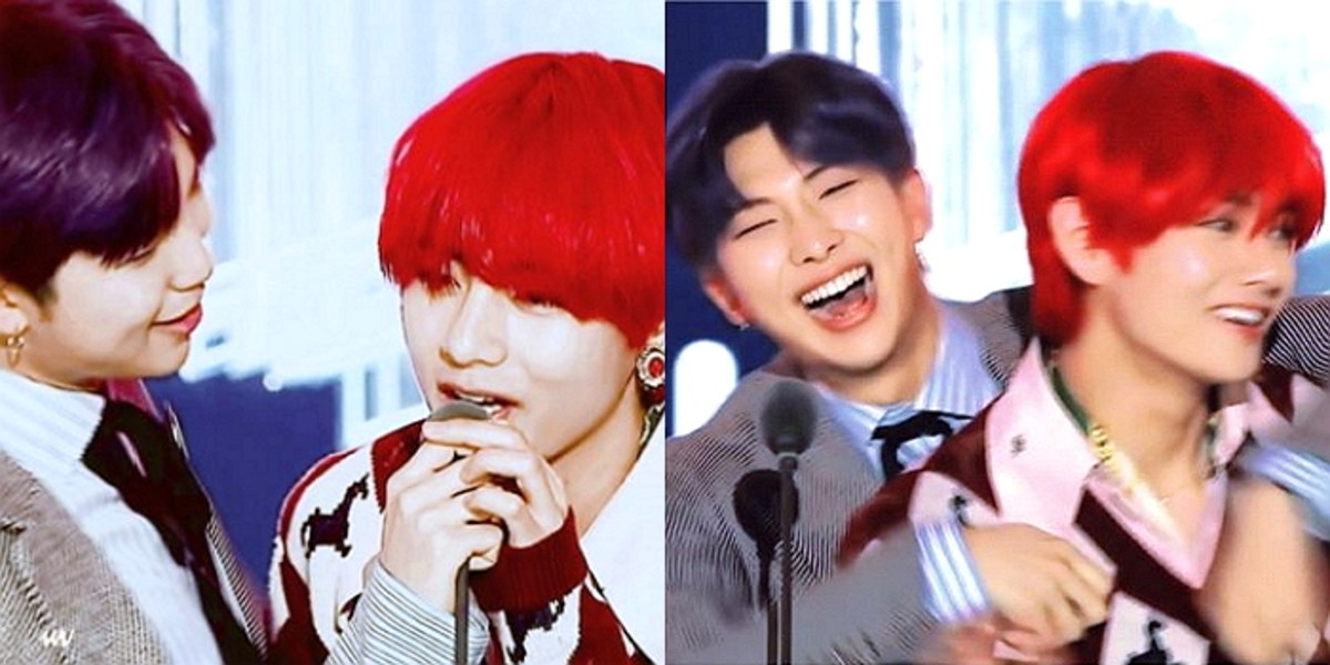 리더 RM은 이러한 뷔의 모습이 귀여웠는지 그를 뒤에서 꽉 끌어안으며 해맑은 웃음을 지어 보였다.
