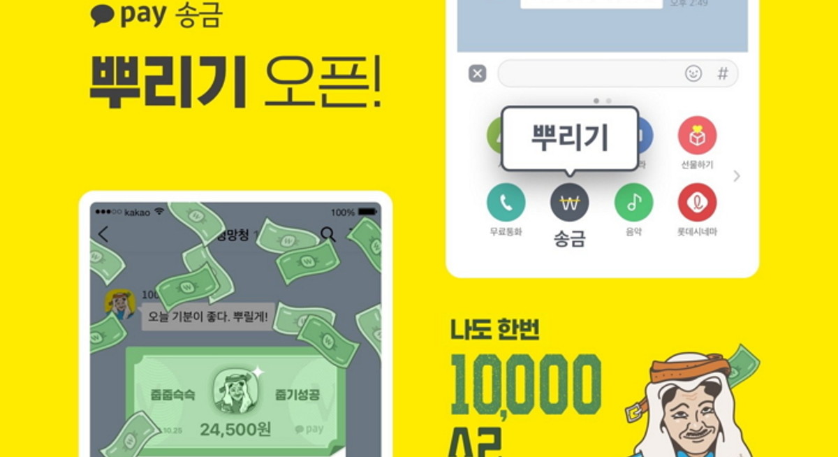 '뿌리기'는 좋은 소식이 있을 때 지인들에게 '한턱' 쏘는 문화에서 착안한 것으로 카카오톡 채팅방에서 송금 서비스로 친구들과 일정 금액을 즐겁게 나눌 수 있는 기능이다.