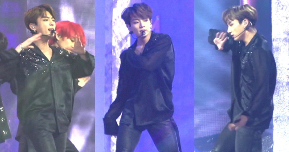 검은 셔츠에 가죽 바지를 매치해 입은 정국은 'FAKE LOVE' 무대에서 파워풀한 안무를 선보이기 시작했다.