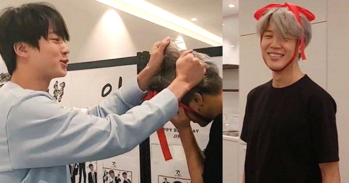 바로 자신의 얼굴에 곱게 리본을 매고 등장한 같은 멤버 지민이었다.