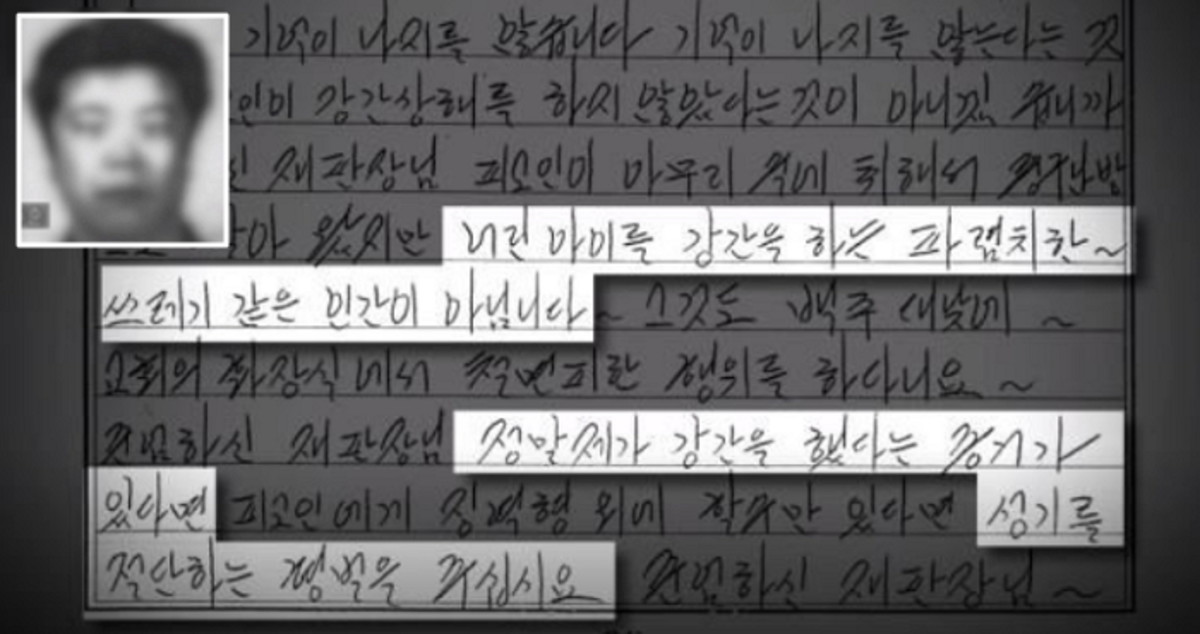 공개된 탄원서에 따르면 조두순은 "(범행에 대해) 아무런 기억이 나지 않는다"며 "기억이 나지 않는다는 것은 강간상해를 하지 않았다는 것이 아니겠느냐"고 주장했다.