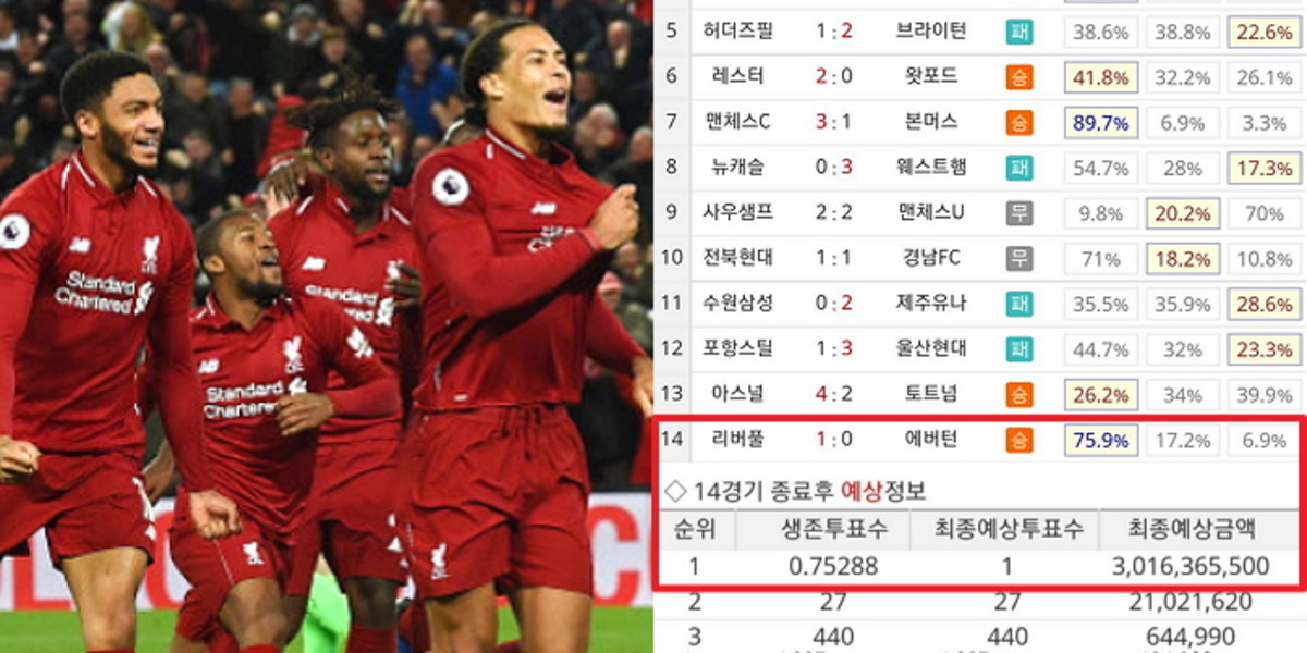 물론 A씨도 리버풀의 승리에 베팅을 했고 그는 14경기를 모두 맞힌 당첨자로 등극했다.