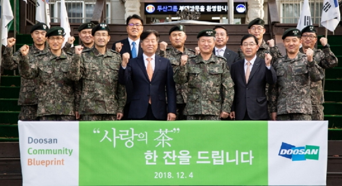 5일 두산그룹은 전날 강원도 양구군 소재 백두산 부대(육군 21사단)에서 '사랑의 차(茶) 나누기' 행사를 가졌다고 밝혔다.
