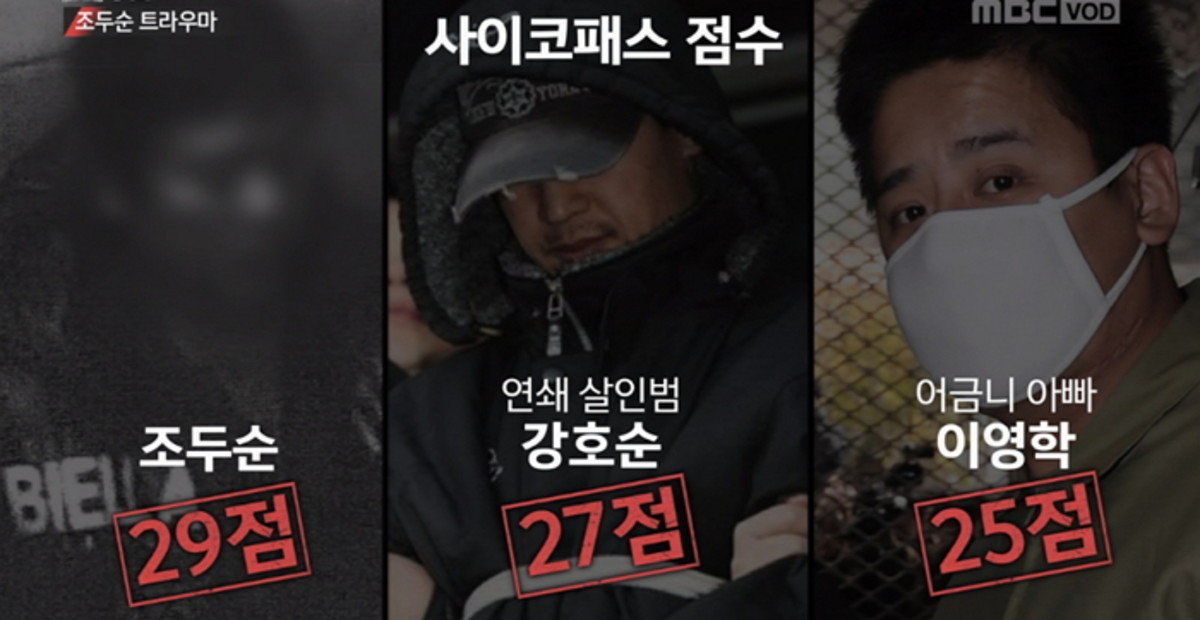 조두순 수사 프로파일러 권일용에 따르면 조두순은 사이코패스 점수에서 29점을 받았는데, 이는 연쇄살인범 강호순(27점)과 어금니 아빠 이영학(25점) 보다 높았다.