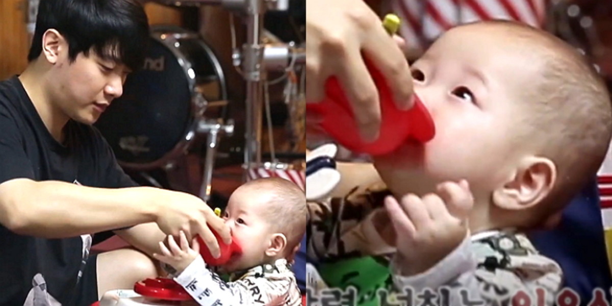 최민환은 숟가락으로 조금씩 먹이는 게 답답했던지(?) 그릇을 들어 아들의 입에다가 직접 넣어줬다.