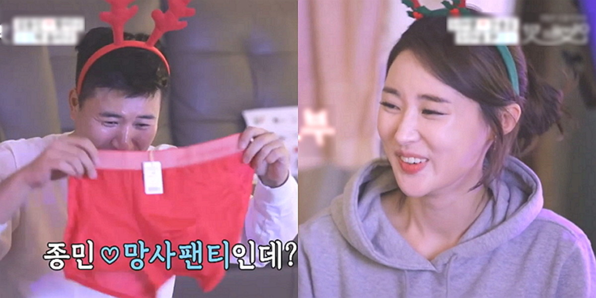 바로 새빨간 팬티. 이 선물을 발견한 황미나는 깜짝 놀라더니 "종민 씨"라며 김종민에게 건넸다.