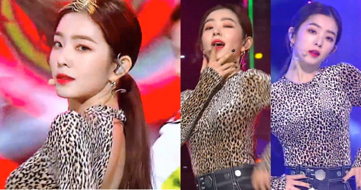 호피 무늬가 새겨진 옷과 함께 가죽바지를 매치해 입은 아이린이 군살 하나 없는 몸매를 뽐냈기 때문이다.