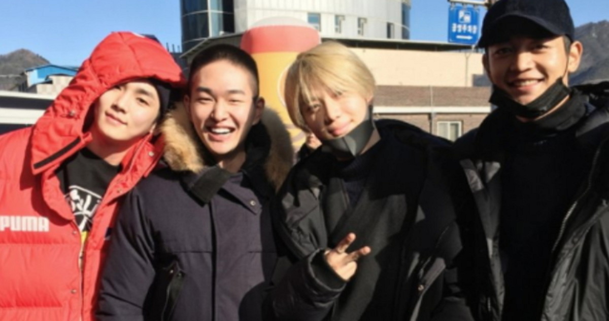이날 민호와 키, 태민은 온유와 인사를 나눈 뒤 훈련소 인근으로 보이는 장소에서 기념사진을 촬영했다.