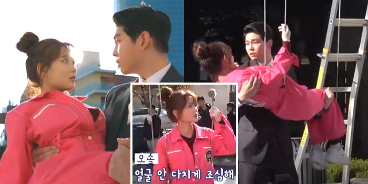 공개된 영상 속에서 김유정은 와이어를 몸에 매단 채 사다리 아래로 떨어지는 장면을 촬영했다.