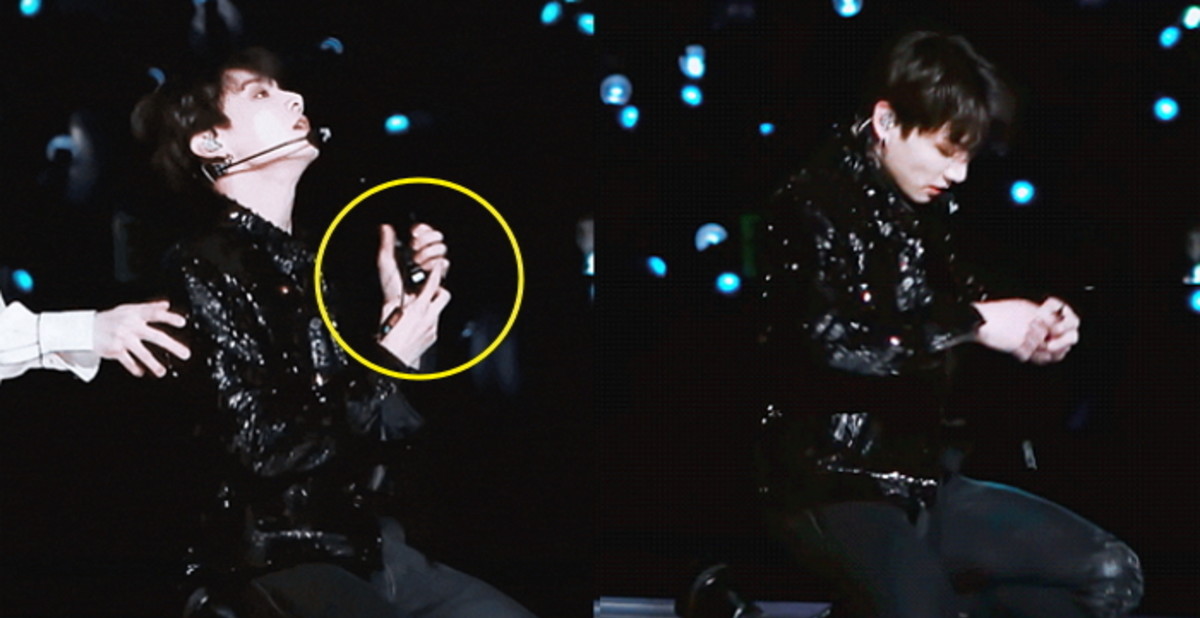 이날 정국은 무대 도중 옷 뒤에 고정해뒀던 마이크가 빠지는 위기를 겪었다.