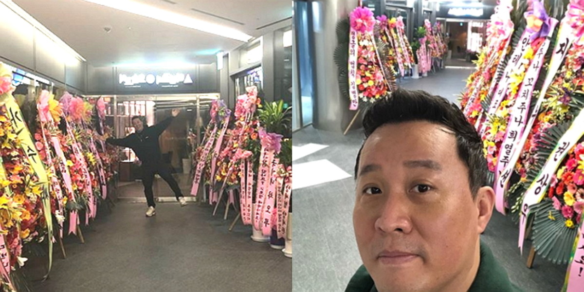 공개된 사진 속에는 화환 앞에서 환히 웃고 있는 정준하의 모습이 담겼다.