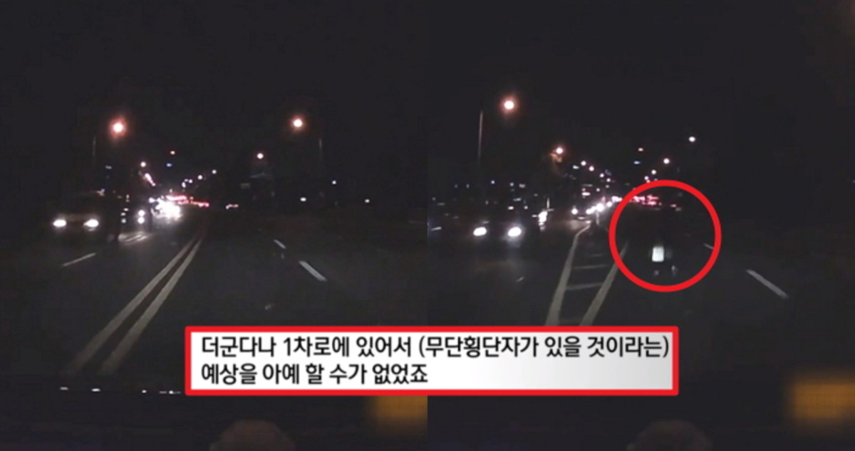 더군다나 1차로로 운전 중이어서 무단횡단하는 사람이 있을 것이라고는 상상하지도 못했다.