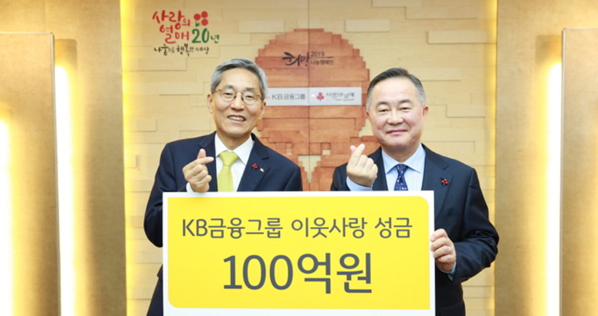 20일 KB금융그룹은 20일 서울시 중구 정동에 위치한 사랑의 열매 회관에서 '희망 2019 나눔캠페인'에 연말 이웃돕기 성금 100억원을 전달했다고 밝혔다.