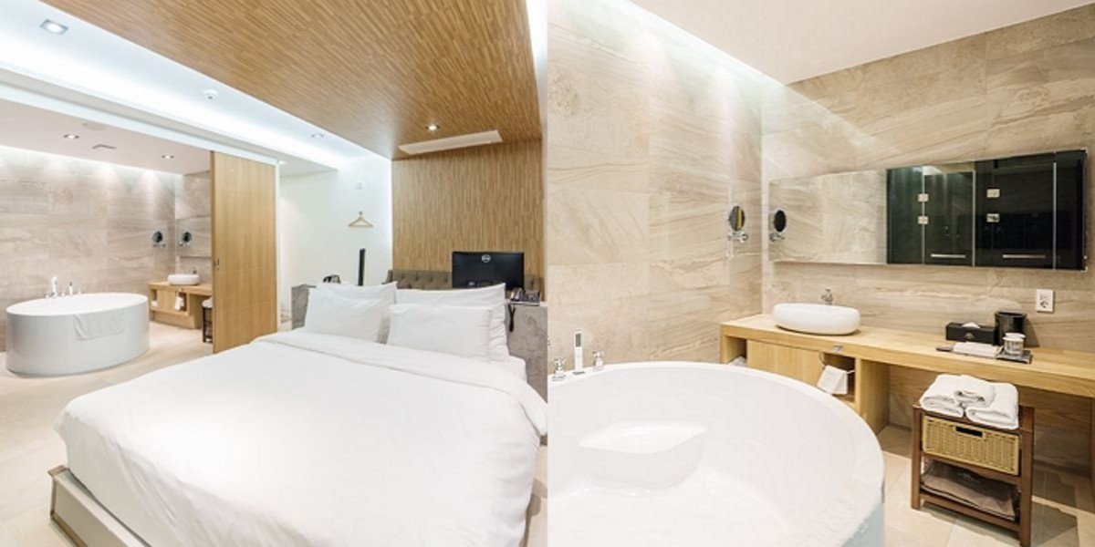 또한 미닫이문으로 마련된 화장실에는 넓은 크기의 원형 욕조가 있어 따뜻한 스파로 하루의 피로를 풀기에도 딱 맞다.