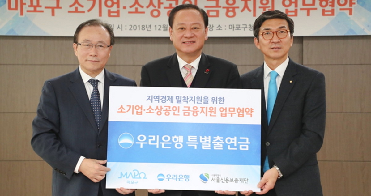 우리은행은 지난 21일 서울시 마포구청 대회의실에서 마포구청, 서울신용보증재단과 '지역경제 밀착지원을 위한 소기업·소상공인 금융지원 업무협약'을 체결했다.