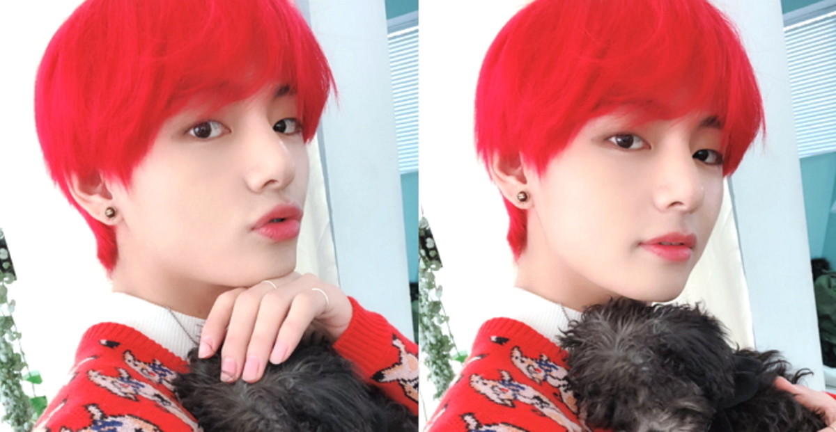 가장 눈에 띄는 사진은 바로 빨간 머리와 빨간 스웨터, 그리고 붉은 입술이 매력적인 뷔의 모습이다.