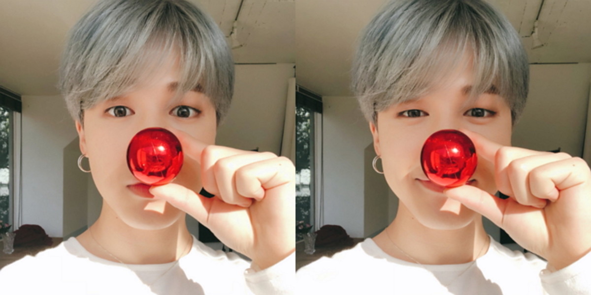 공개된 사진 속 지민은 빨간색 장식품을 코에 갖다 댄 채 잔망스러운 표정을 짓고 있다.