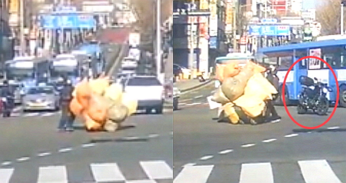 짐이 가득 담긴 수레를 끌고 사거리를 가로지르던 할머니가 무게를 이기지 못하고 쓰러진 것이다.