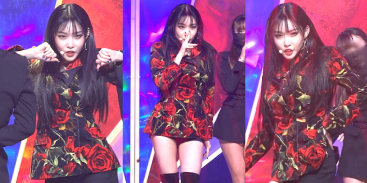 이날 무대에서 청하는 붉은 장미가 새겨진 재킷과 검은색 롱부츠를 매치한 채 등장했다.