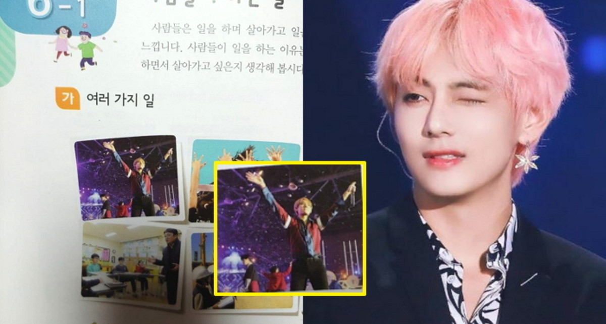 게시물에는 '사람들이 하는 일'이라고 적힌 교과서에 '여러 가지 일'의 예시에 쓰인 뷔의 사진이 담겼다.