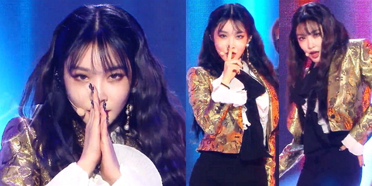 이날 청하는 검은색 리본이 달린 흰색 블라우스에 금색 재킷을 입고 등장했다.