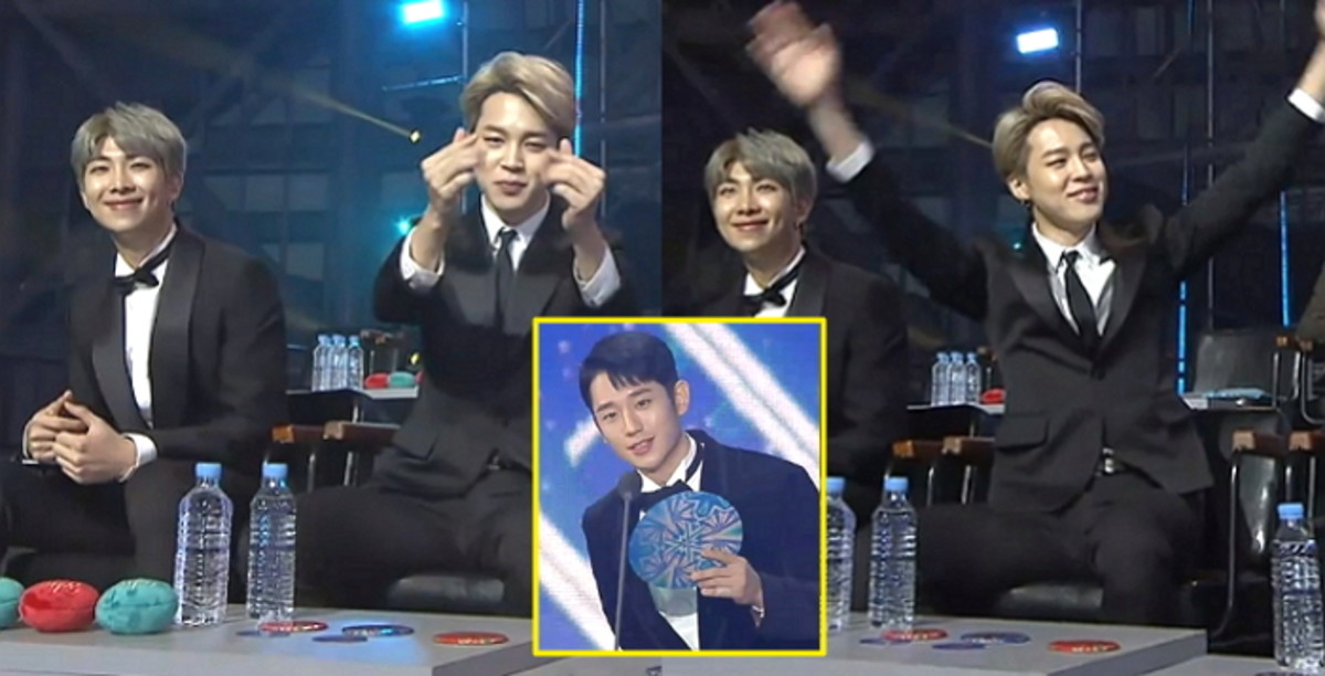 지민은 두 손을 머리 위로 들어 크게 흔드는가 하면 하트를 날리며 정해인의 말에 감사를 표했다.
