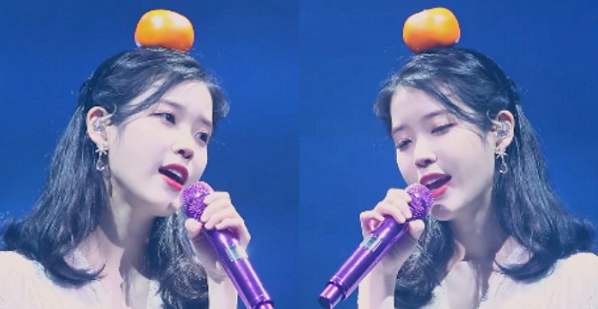아이유는 노래 분위기에 맞춰 상큼한 '귤 머리띠'를 매치하는 센스를 발휘했다.