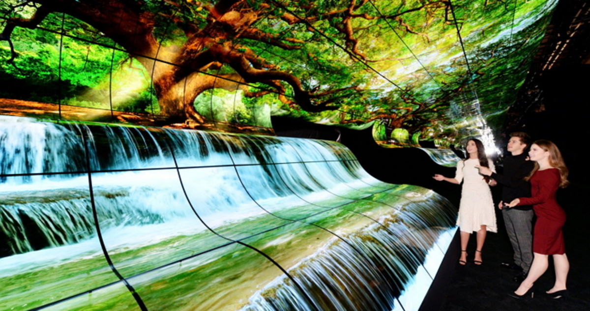 전시관 입구에는 '올레드 플렉서블 사이니지' 260장을 이어붙여 초대형 '올레드 폭포' 조형물이 관람객들의 눈길을 끈다. 완벽한 블랙, 곡면 디자인 등 올레드만의 장점을 활용해 대자연의 웅장함을 담았다.