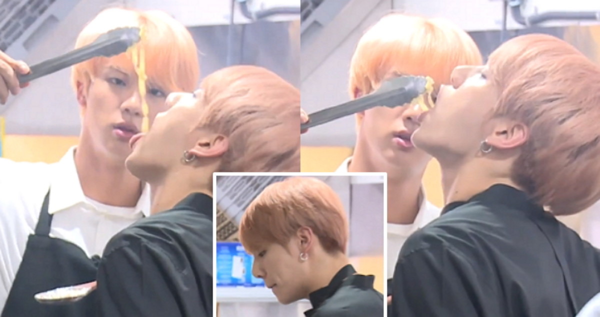 진은 정국에게도 맛을 보여주고 싶었는지 집게로 파스타를 집은 뒤 곧장 그에게 달려갔다.